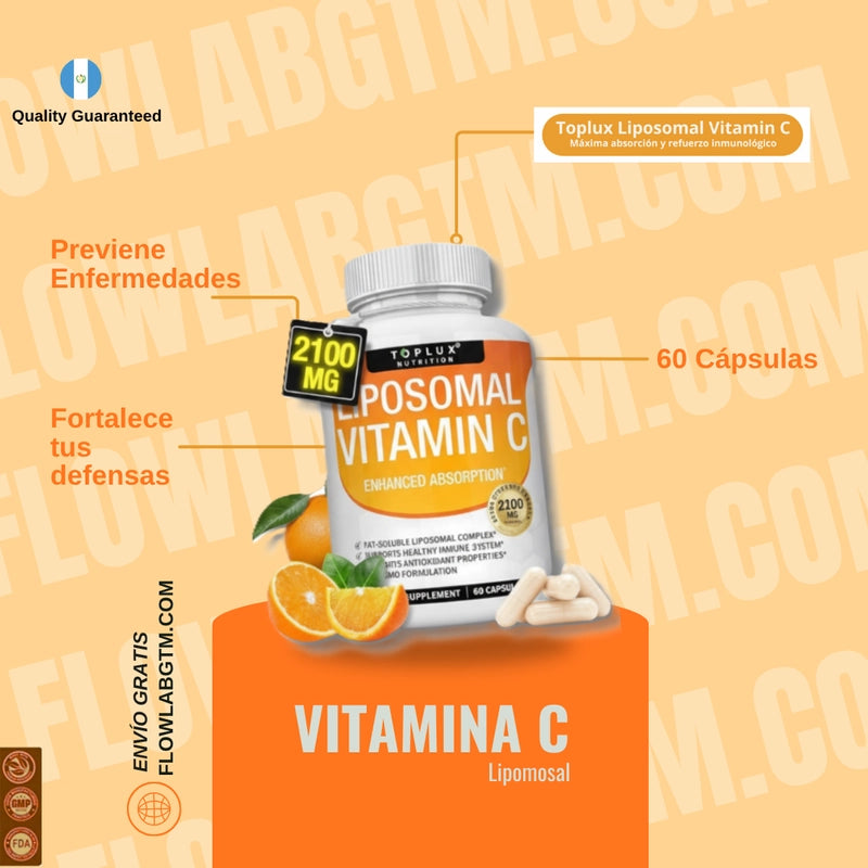 Nuestra vitamina C liposomal de Toplux Nutrition ofrece una absorción potente, lo que significa que tu cuerpo aprovecha al máximo cada dosis de 2100 mg para un bienestar superior.
